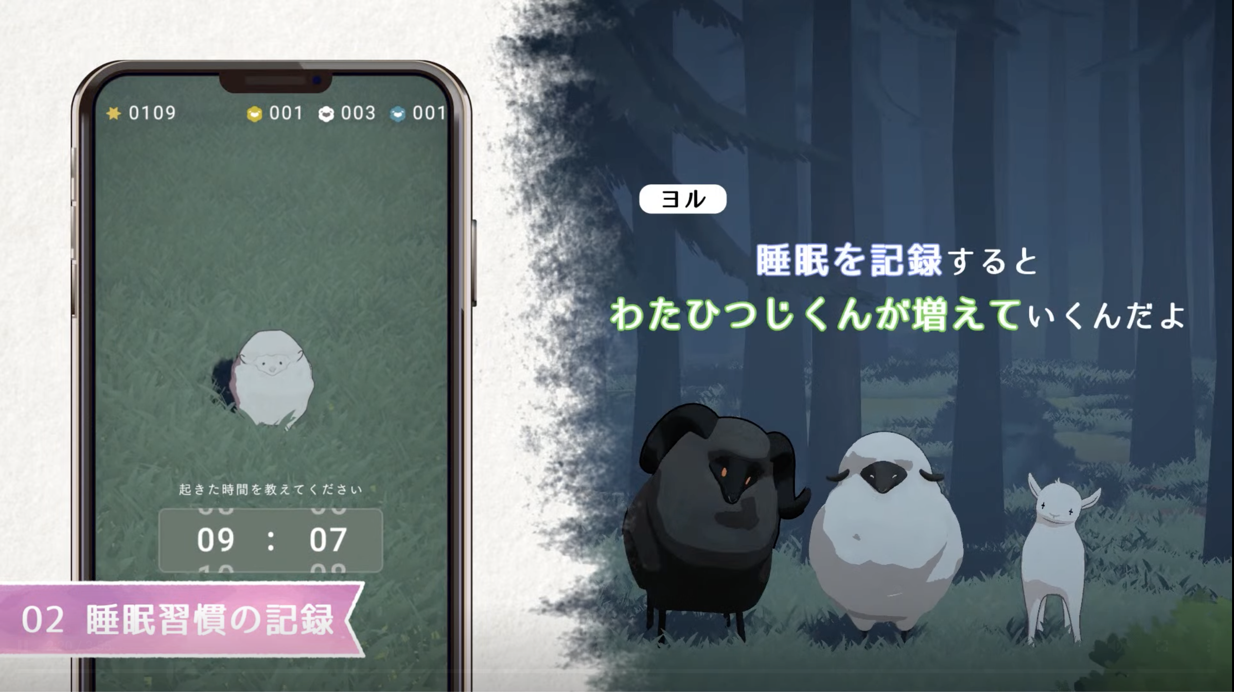 「よひつじの森」は、寝る前についスマホを触ってしまうことで寝つきが悪くなったり、夜更かしをしてしまったりする人に向けて企画・開発された、睡眠習慣記録用のスマホ向けアプリケーション(iOSのみ対応)です。