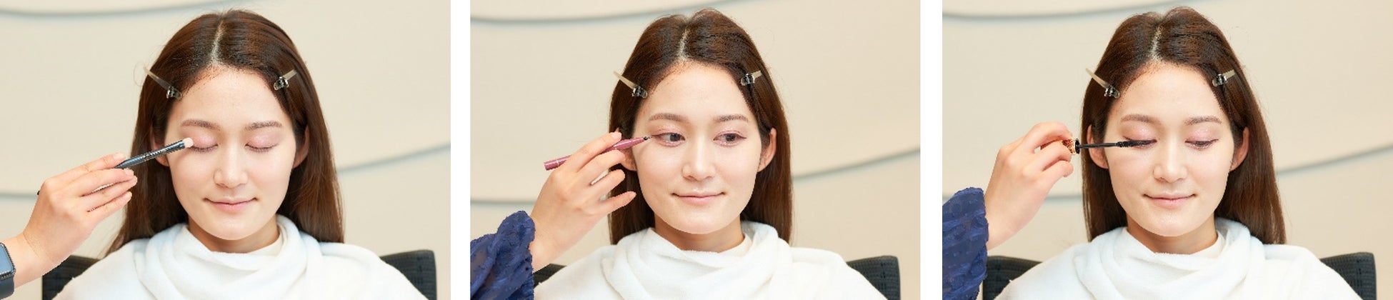 アイライナーは、くすみがかったピンクブラウンを使用。自然に目を大きく見せてくれる赤みのあるアイライナーで、目尻を下げてから最後に跳ね上げることで、かわいらしい印象もありながら大人っぽいスパイスもプラスします。