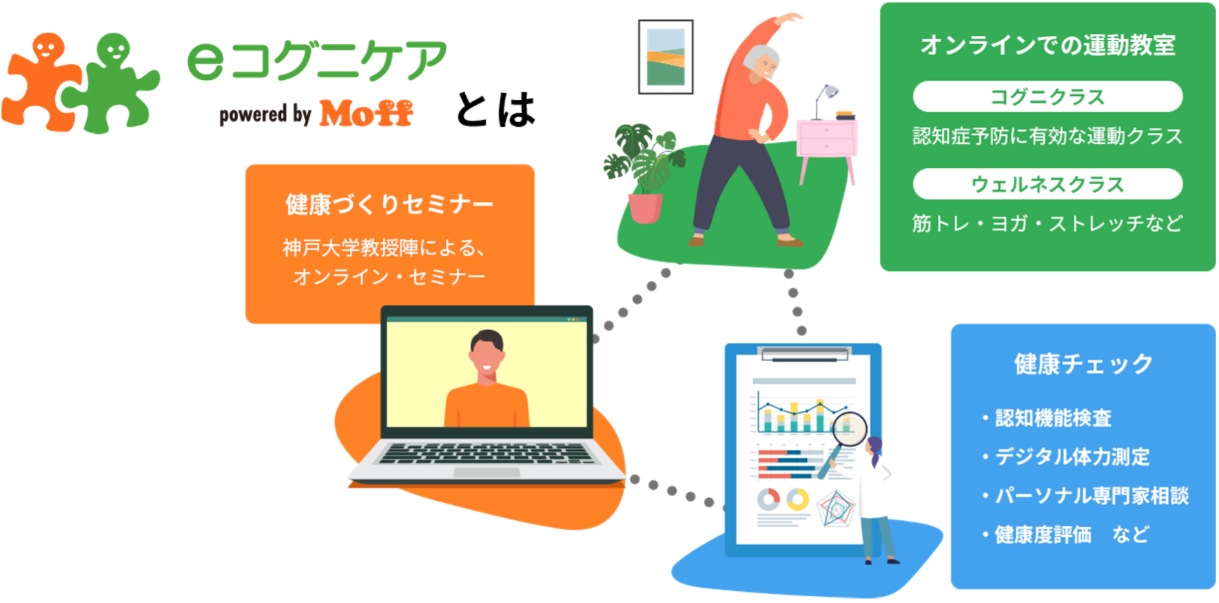 神戸大学とMoffが共同で開発した自宅から参加できるオンライン型の認知症予防・健康づくりサービスです。認知症や生活習慣病の「予防」に良いとされる研究成果をもとに神戸大学が開発した運動教室、Moffが開発したデジタル体力測定、さらには認知機能検査、健康づくりセミナーがセットになったサービスです。パソコンやスマートフォンを使い、自宅から受講することができます。
