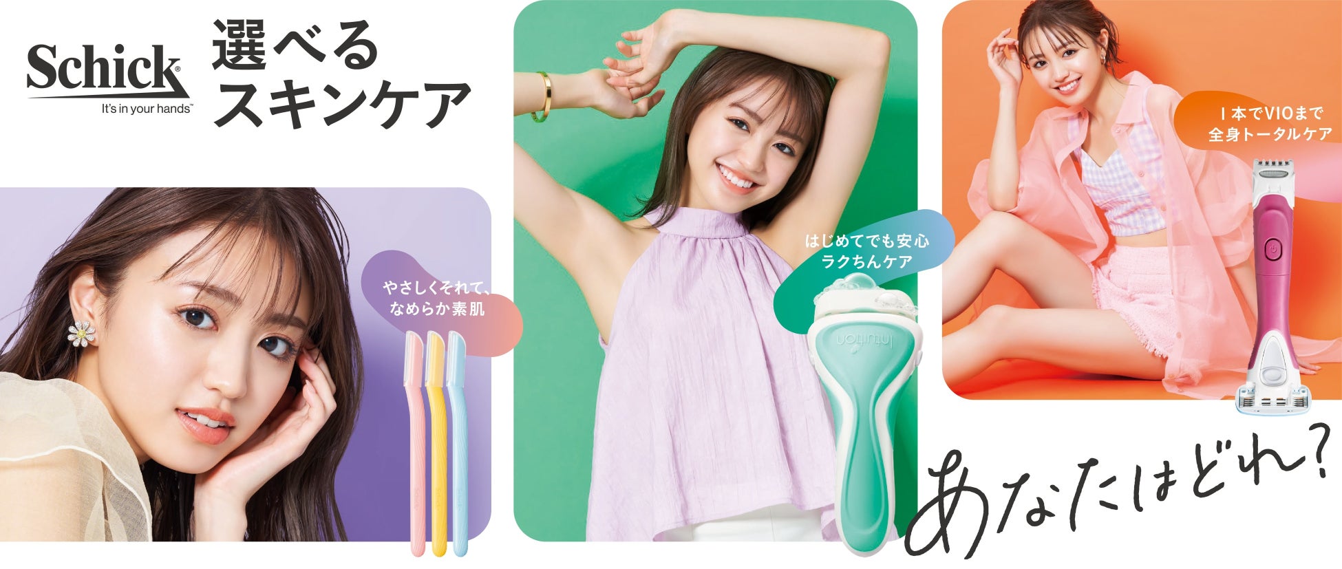 「今日の私はどのSchick?」の問いかけから始まり、ケアしたい部位や目的に合わせてSchickの商品の中から適切な商品を選ぶ楽しさを表現しています。