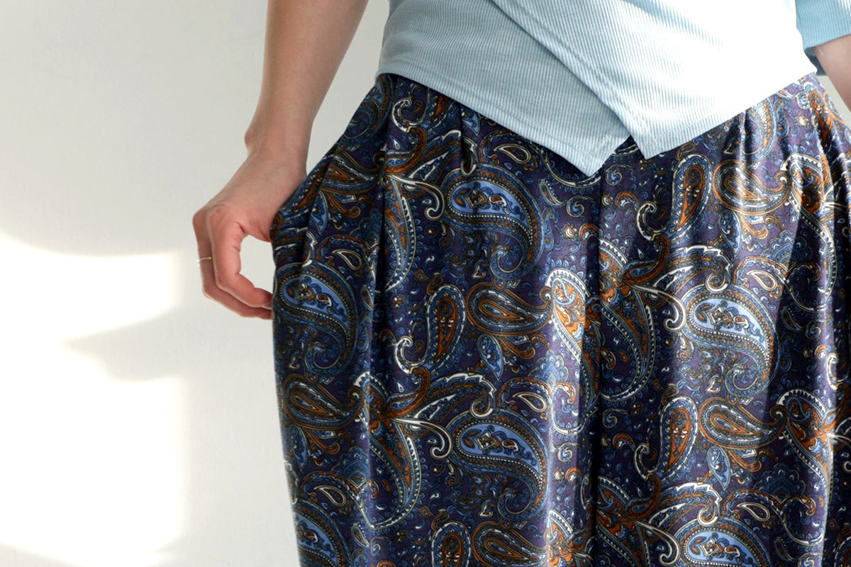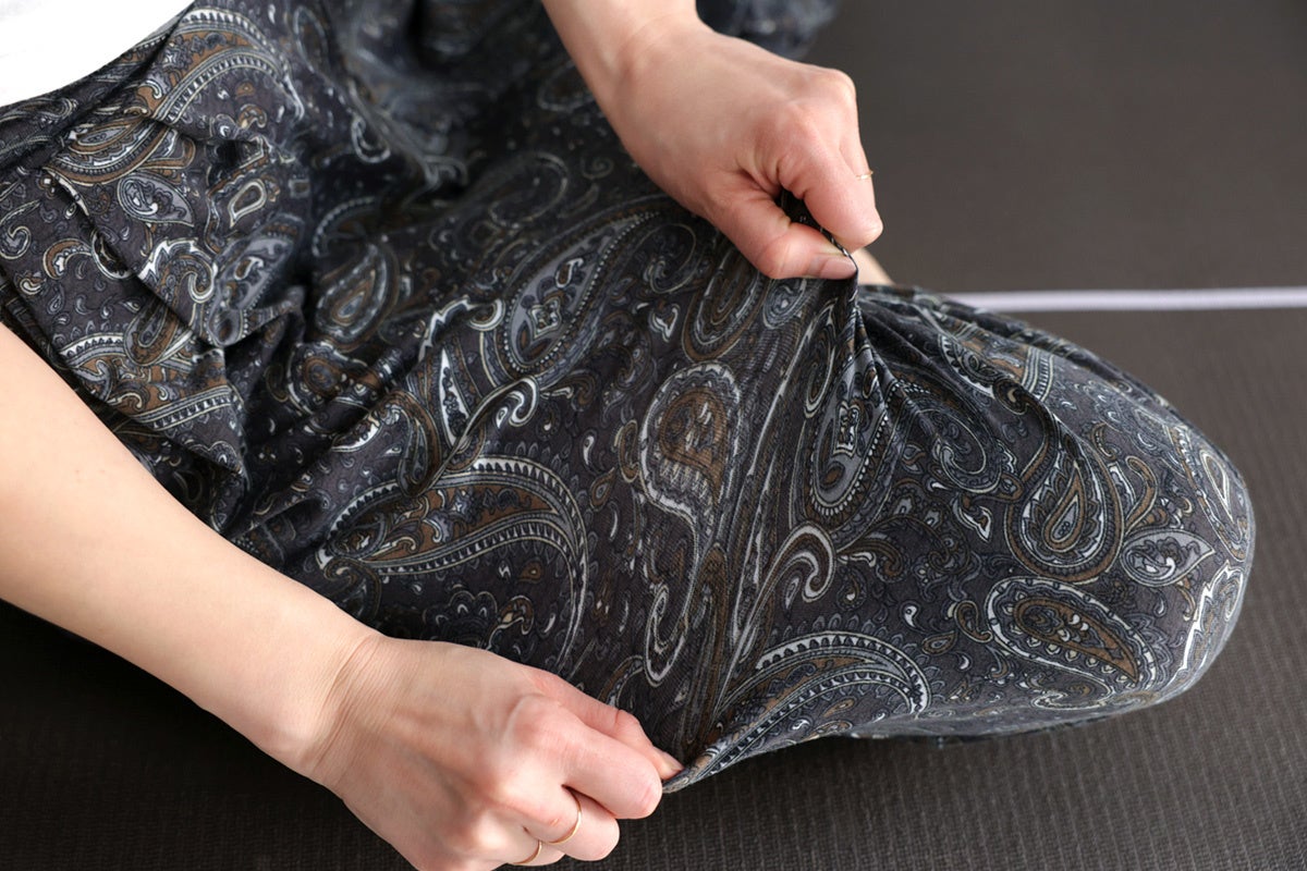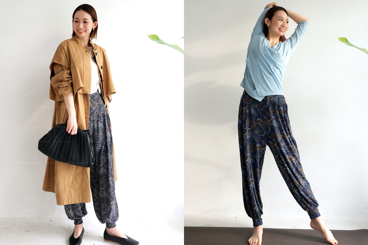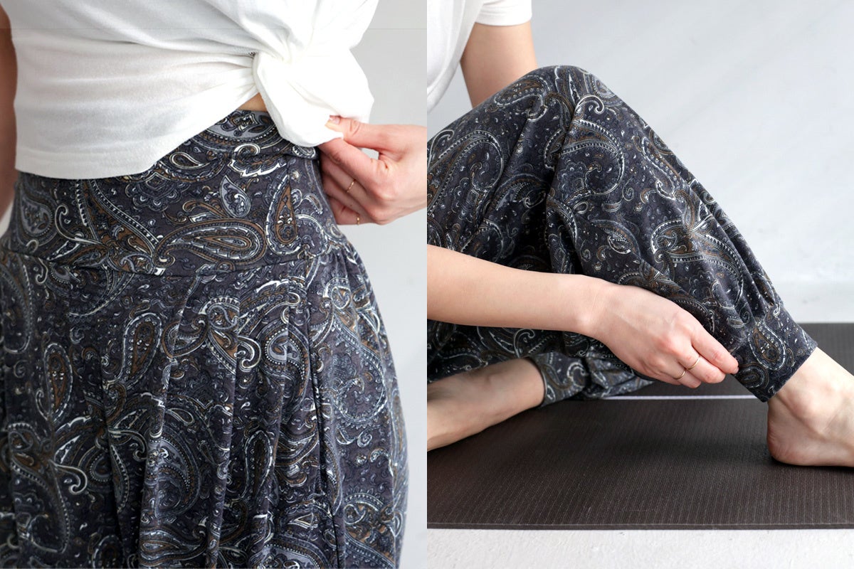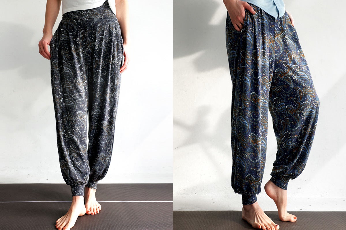 従来のアラジンパンツは無地でしたが、今回は廣田なおさんおすすめのペイズリー柄が登場。ヨガはもちろん普段づかいにも使いやすい、くすみカラーのブルー、グレーの2色展開となります。