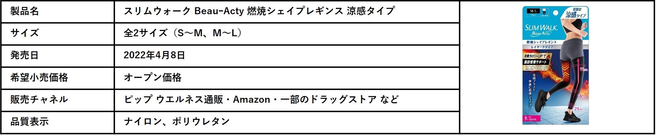 ピップ株式会社(本社:大阪市中央区、代表取締役社長:松浦由治)の着圧レッグウェアブランド「スリムウォーク」は、美脚にこだわった“着圧×スポーツ”のブランド「スリムウォーク Beau-Acty (ビューアクティ) 」シリーズより、「スリムウォーク BeauーActy 燃焼シェイプレギンス 涼感タイプ」を、2022年4月8日(金)よりピップ ウエルネス通販・Amazon・一部のドラッグストアなどで数量限定で販売開始します。「スリムウォーク Beau-Acty 」シリーズ初の涼感タイプの着圧レギンスとなります。