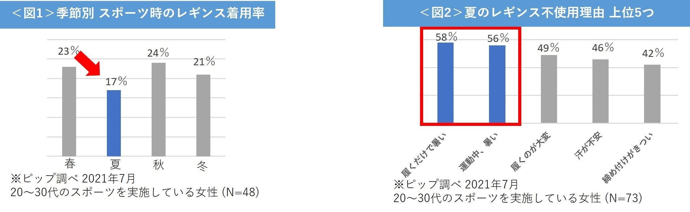 「スリムウォーク BeauーActy」は、美脚にこだわった“着圧×スポーツ”のブランドです。2018年に誕生して以来、スポーツ用レギンスをはじめ様々な製品を販売しています。スポーツ用レギンスは、運動中スムーズな脚運びをサポートすることはもちろん、紫外線対策になるなど様々な利点がありますが、「夏」になると着用率が低下する傾向にあります<図1>。夏にレギンスを着用しない理由としては、「履くだけで暑い(58%)」と回答した人が最も多く、次いで「運動中、暑い(56%)」と回答した人が多い結果となり、夏場は「暑さ」が理由で着用を控える人が多い様子です <図2>。