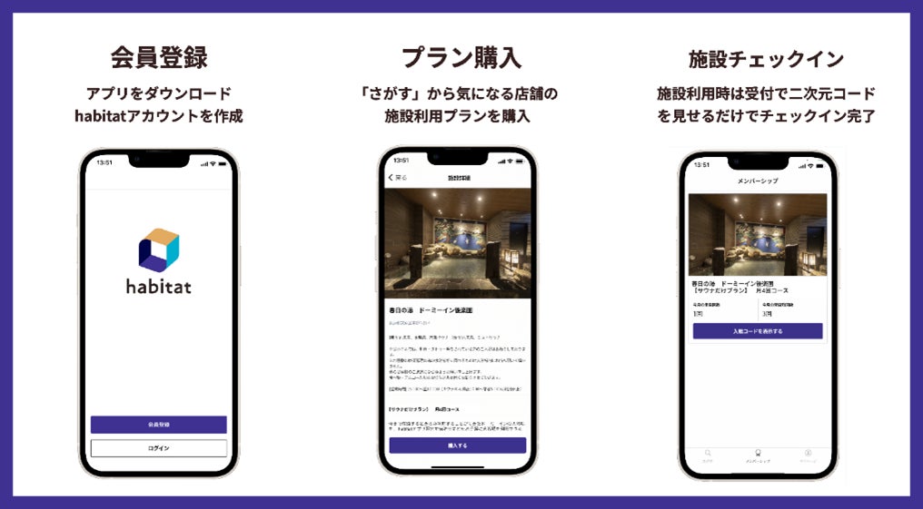 「habitat」のアプリをダウンロードして、ユーザーアカウントを作成。プランを選択し、事前に予約&決済を行い、店頭では発行されたQRの入館コードを提示するだけで利用可能です。