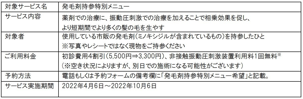 治療を検討している方で、自身が使用している市販の発毛剤(メーカー問わず国内で生産されている、ミノキシジルが含まれているもの)を初診時に持参すると初診費用が4割引になります。また、ミノキシジルの効果を促進する日本初技術を搭載した「非接触振動圧刺激装置」による施術をサービス実施期間中、無料で受けることができます。