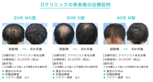 市販の発毛剤(外用薬)では十分な効果が感じられない方でも、クリニックで内服薬を併用することで、改善が期待できます。お悩みの方は一度クリニックを受診することをおすすめします。