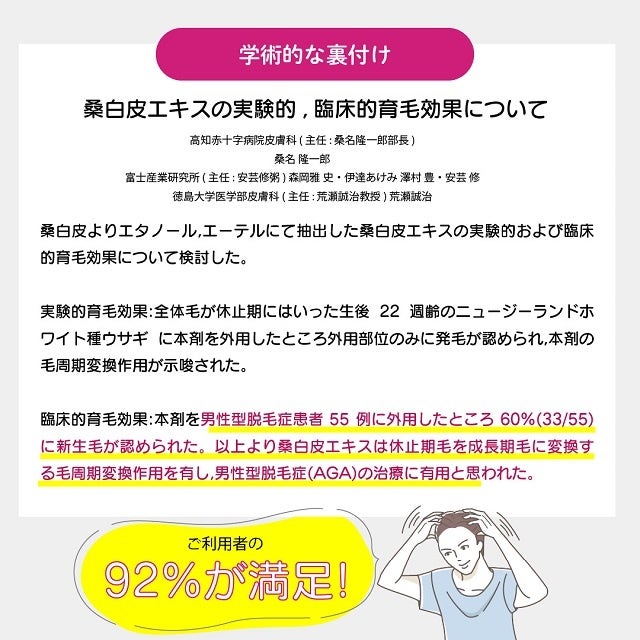 科学的裏付けのある自然素材の「桑白皮エキス」配合で、臨床実験でも、毛周期変換作用が認められています。