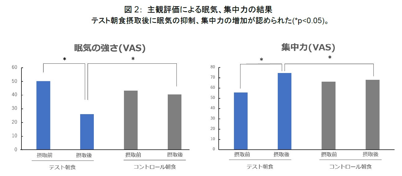 VASによる主観評価では、テスト朝食摂取後に眠気の減少、集中力の向上、疲労感の減少、気分の向上が認められましたが(p<0.05, 図2)、コントロール朝食摂取前後では差が認められませんでした。