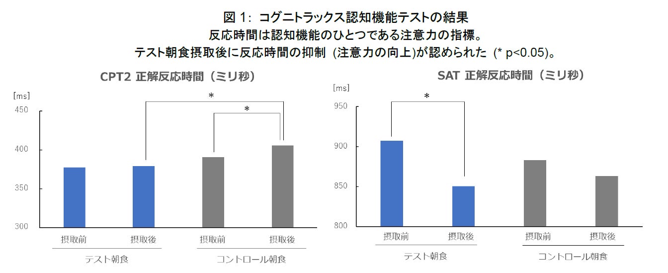 テスト朝食摂取後の4パート持続処理テスト(SFCPT)パート2平均正解反応時間は、コントロール朝食摂取後よりも26.9ミリ秒短縮した(p<0.05, 図1) 。反応時間の短縮は注意力(集中力)向上の指標として知られている。
