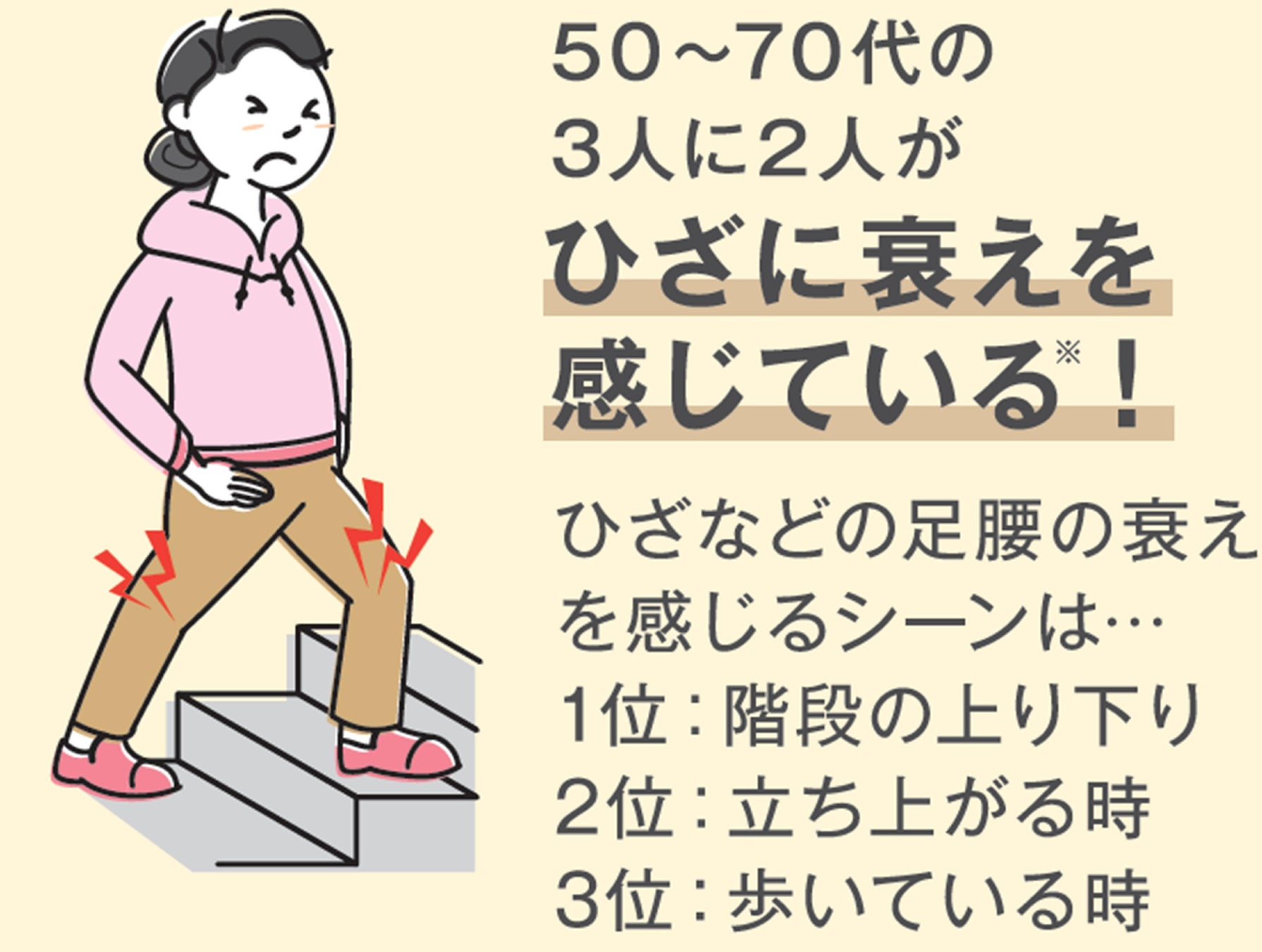 50~70代の3人に2人が「ひざ」に衰えを感じているといわれています。
