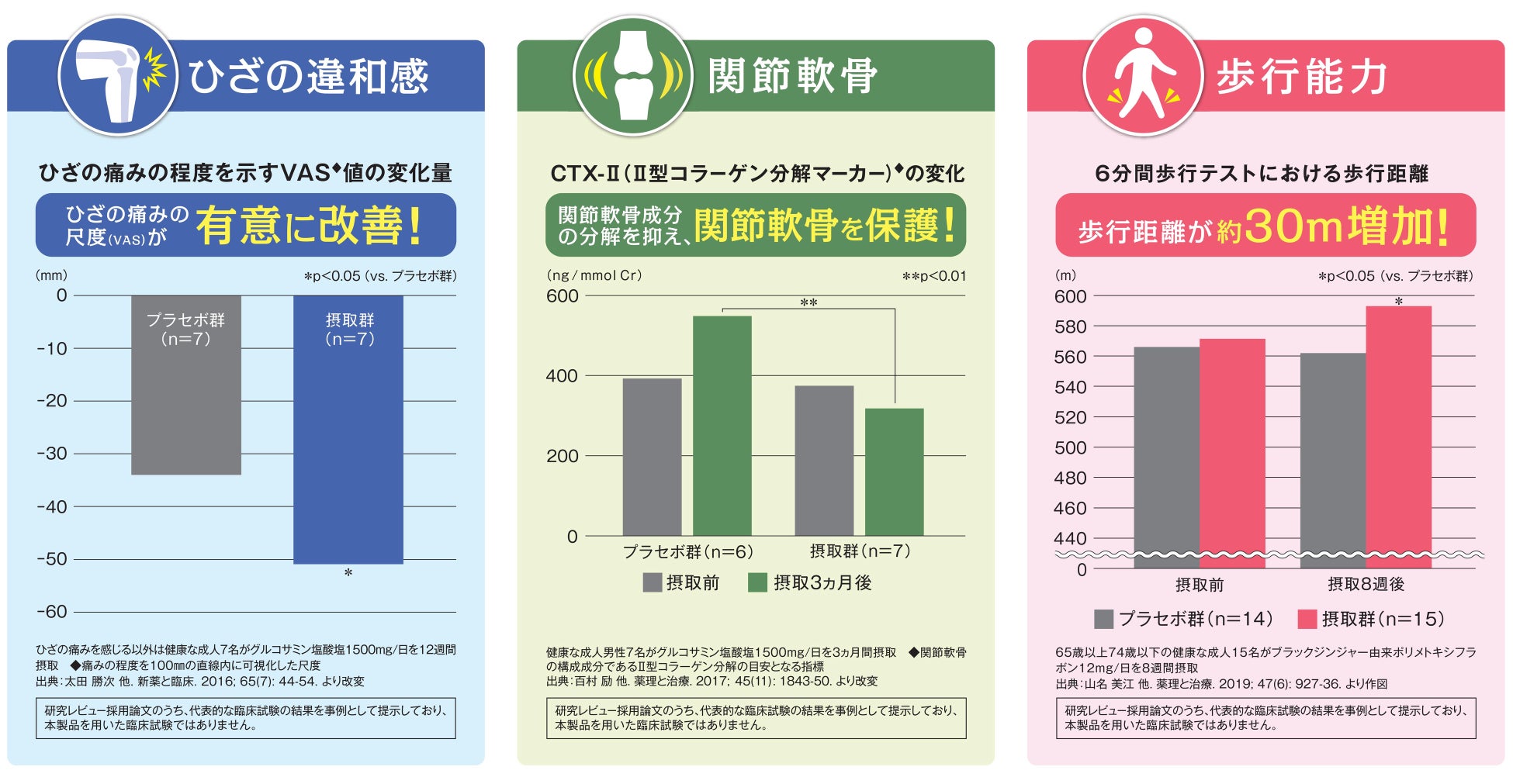本品には、グルコサミン塩酸塩、ブラックジンジャー由来ポリメトキシフラボンが含まれます。 グルコサミン塩酸塩はひざ関節の曲げ伸ばしを円滑にし、 ひざの違和感を軽減する機能や、運動における過剰な軟骨成分の 分解を抑えることで、関節軟骨の正常な代謝を促すのに役立ち、 関節軟骨を保護する機能が報告されています。 ブラックジンジャー由来ポリメトキシフラボンは、 脚の曲げ伸ばし等の筋肉に軽い負荷がかかる運動との併用で、 年齢とともに低下する脚の筋力に作用することにより、 中高年の方の歩行能力の向上に役立つ機能が報告されています。 |