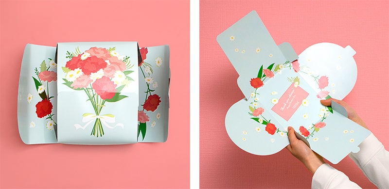 ボックスを開くと、まずはカーネーションの花束がお出迎え。さらに開くと、鮮やかな花々のイラストと、「ありがとう」のメッセージが咲き誇ります。
