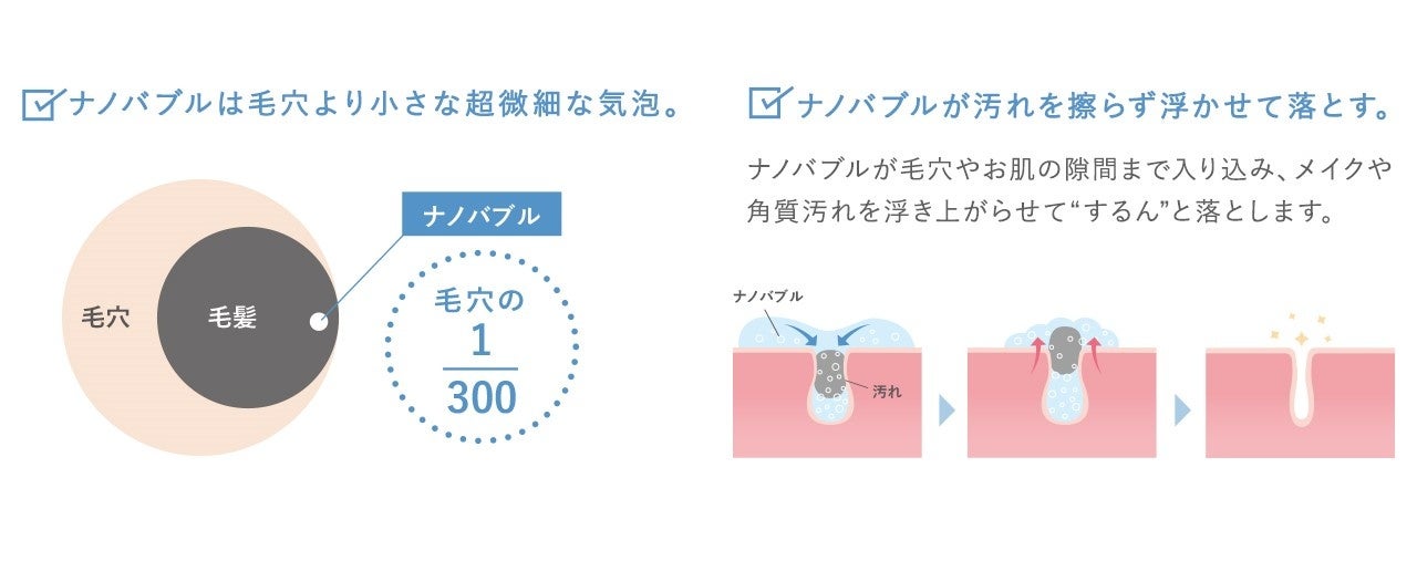 石鹸泡の1/100以下のサイズであるナノバブルは毛穴の奥まで入り込み、メイクや角質汚れを浮き上がらせることができるので、肌のバリア機能を壊すことなくうるおいのある洗い上がりに導きます。