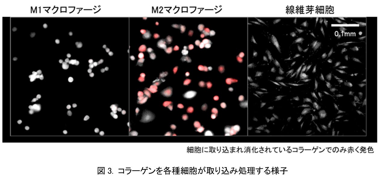 次に、マクロファージに特徴的な生体内物質を取り込み消化・除去する機能と、皮膚のコラーゲン代謝との関わりを明らかにする目的で、M1、M2マクロファージおよび線維芽細胞が変性コラーゲン※6 を消化する能力について検証しました。その結果、M2マクロファージが顕著に変性コラーゲンを取り込み消化・除去していることが分かりました(図3)。線維芽細胞は、本来の健全な立体構造をもったコラーゲンと結合している方がより多くのコラーゲンを産生することが知られています。M2マクロファージによって変性コラーゲンが適切に除去されることで、よりコラーゲンが産生されやすい環境が作り出されている可能性が示されました。
