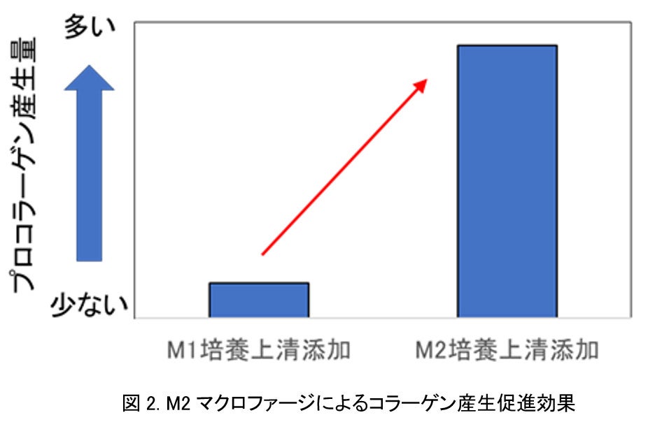 M1/M2バランスは、皮膚の傷が治る過程(創傷治癒)におけるコラーゲン代謝のコントロールに重要であることが近年報告されています。そこで、M1、M2マクロファージが線維芽細胞によるコラーゲンの産生と分解に与える影響について検証しました。その結果、皮膚組織において、M1/M2バランスとコラーゲン発現に相関関係が確認されました。また、M1マクロファージの培養上清※5 を線維芽細胞に添加した場合に、コラーゲン産生抑制・分解促進が起こることでコラーゲン線維が顕著に減少することが明らかになりました(図1)。加えて、M2マクロファージの培養上清を添加した場合には、M1マクロファージの培養上清を添加した時と比較してコラーゲンの前駆体であるプロコラーゲンを指標にした評価でコラーゲン産生が促進されることが分かりました(図2)。