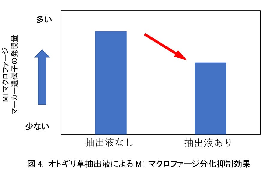 M1マクロファージは、そのもととなる一般的なマクロファージから分化することで機能を発揮することが知られているため、M1マクロファージへの分化を抑制する薬剤を探索しました。その結果、オトギリ草抽出液にM1マクロファージへの分化を抑制する効果があることがわかりました(図4)。M1マクロファージへの分化が抑制されることで、M2マクロファージが増えやすい環境になることが期待されます。