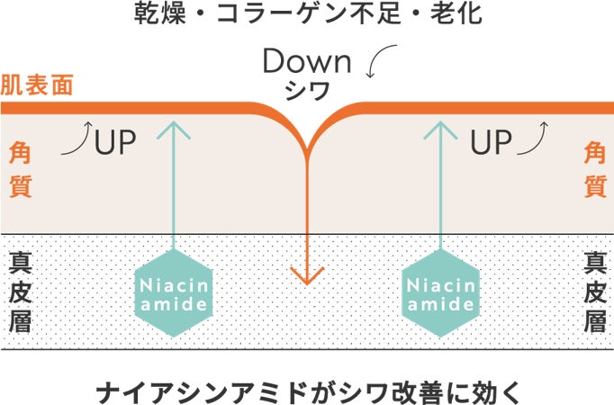 ビタミンB群の一種である「ナイアシンアミド」が作用することで、肌の弾力を支えるコラーゲンの生成を促進、肌をぐっと押し上げることでシワが改善されます。