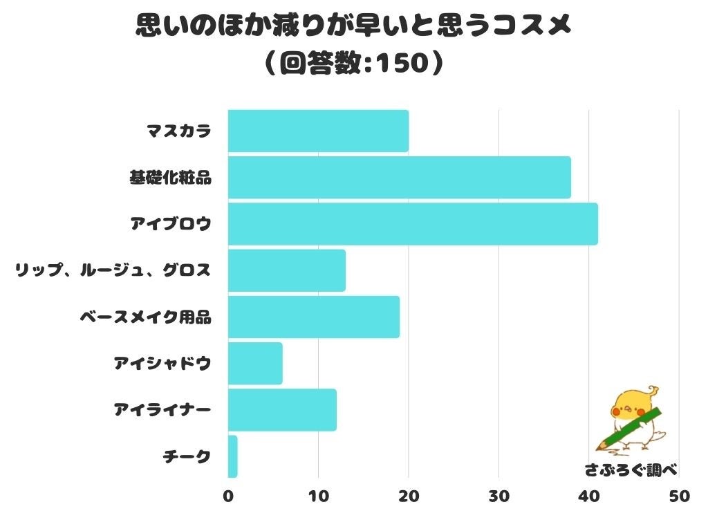 思いのほか減りが早いと思うコスメをアンケートにて調査したところ、1位は「アイブロウ」でした。