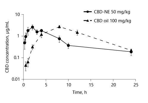 昭和大学の研究結果(https://pubmed.ncbi.nlm.nih.gov/34676332/)では、水溶性原料は通常の原料と比較し、使用してから血中濃度が最高になる(一般的に効き目が最大される)までの時間は通常の原料と比較して3分の1に短縮され、生体吸収率(血中濃度 – 時間曲線下面積)は1.65倍に増えたとされています。