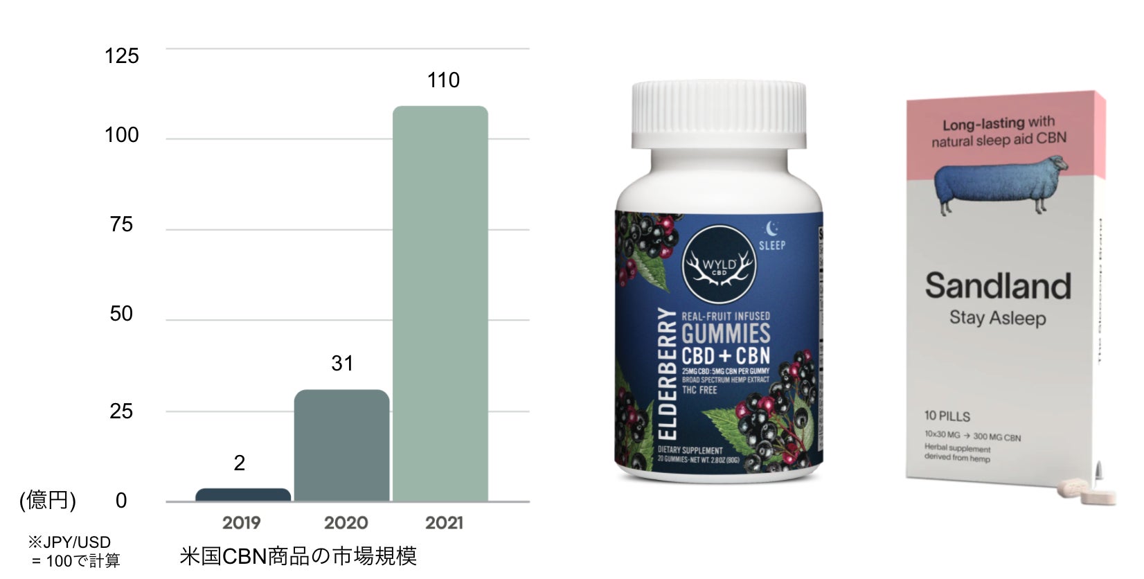 米国企業のレポートに基づくCBN市場の推移ですが、2021年時点で既に100億円の市場規模があり、グミやタブレットなどを中心に商品が増え、急成長しています。
