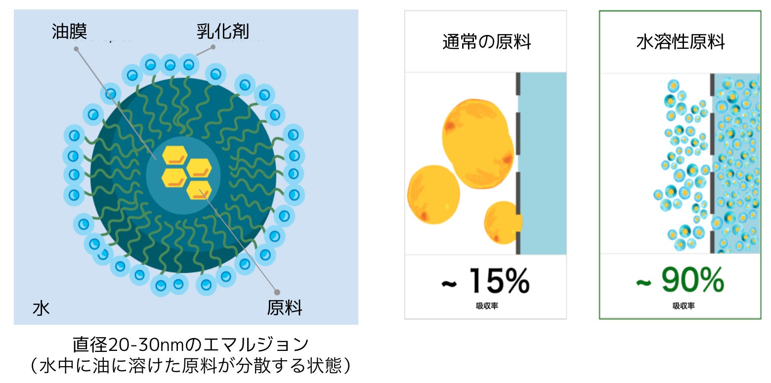 分子をナノサイズの粒子に分解した上で、油に溶けた状態にし、それを乳化剤で覆います。極小の油が水の中に浮く形(水中油滴型)で水の中で分散し、安定性を保つため、水に溶けているように見えます。