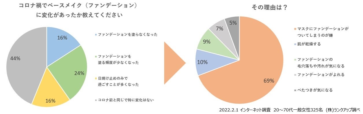 コロナ禍の新しい生活様式として、マスクは毎日の生活に欠かせないものとなっています。外出の機会が減り、マスクで顔の大部分が隠れることから、メイクの頻度が減っています。その傾向はベースメイクにも表れており、当社独自調査の結果、「ファンデーションを塗らなくなった」「ファンデーションを塗る頻度が少なくなった」「日焼け止めのみで過ごすことが多くなった」と回答した方が半数を超え、その理由として69.2%が「マスクにファンデーションがつくのが嫌」と答えています。