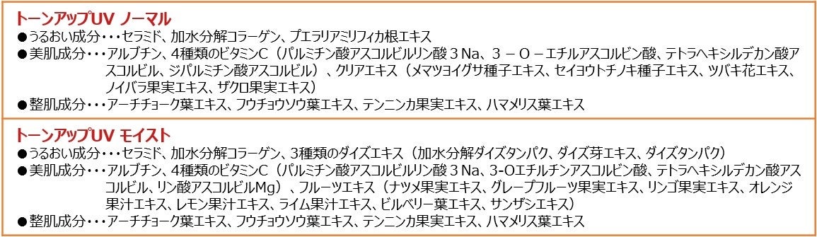 〈トーンアップUV〉はノーマルとモイストの2タイプあります。ノーマルタイプでは、肌内部にうるおいを浸透*1させつつ、表面は素早くなじんでサラリと仕上げるスムースモイスチャーフィット成分*2と余分な皮脂やべたつく油分をしっかり吸着する皮脂吸着パウダー*3を備えた「うるサラ処方」を採用し、うるおいを抱えながらも、皮脂によるヨレや崩れを防いで、マスクにつきにくいよう、設計しています。