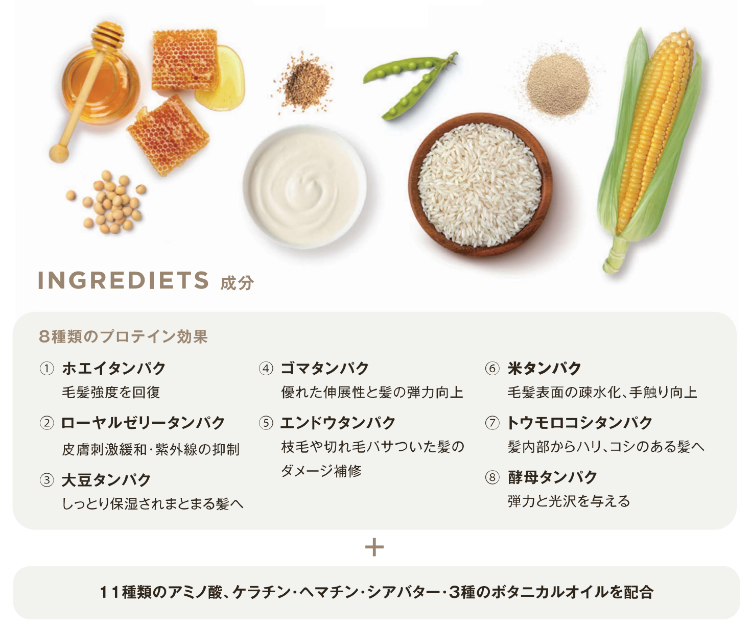 ・8種類のプロテインと11種類のアミノ酸、ケラチン・ヘマチン・シアバター・3種のボタニカルオイルを配合