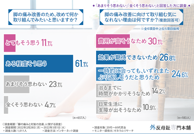 「脚の痛み改善のため、改めて何か取り組んでみたいと思いますか?」と質問したところ、7割以上の方が『とてもそう思う(11.1%)』『ある程度そう思う(61.1%)』と回答しました。