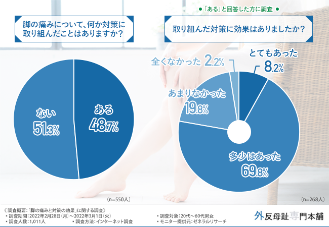 そこで、「脚の痛みについて、何か対策に取り組んだことはありますか?」と質問したところ、半数近くの方が『ある(48.7%)』と回答しました。
