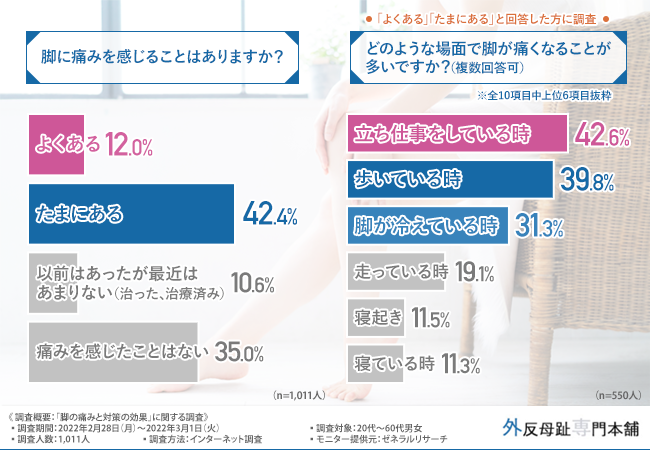 外反母趾専門本舗(https://www.rakuten.co.jp/sincerus/)を運営する株式会社シンケールス(本社所在地:兵庫県明石市、代表取締役:岡村 玲央奈)は、20代~60代男女を対象に、「脚の痛みと対策の効果」に関する実態調査を実施しました。