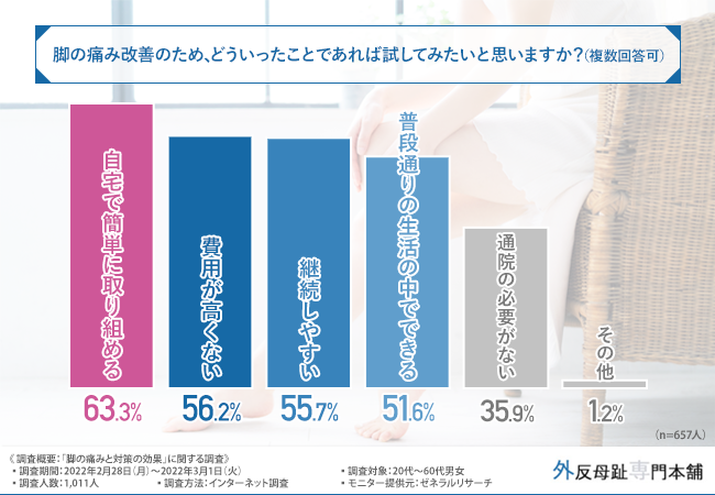 手間や費用をかけず、簡単に取り組めることを重視している方が多いことから、忙しい生活の中で脚の痛みのためにわざわざ時間を取るというのは難しい様子が窺えます。