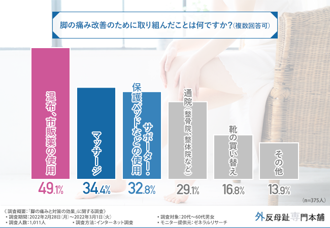 そこで、「脚の痛み改善のために取り組んだことは何ですか?(複数回答可)」と質問したところ、『湿布、市販薬の使用(49.1%)』と回答した方が最も多く、次いで『マッサージ(34.4%)』『サポーター・保護パッドなどの使用(32.8%)』と続きました。