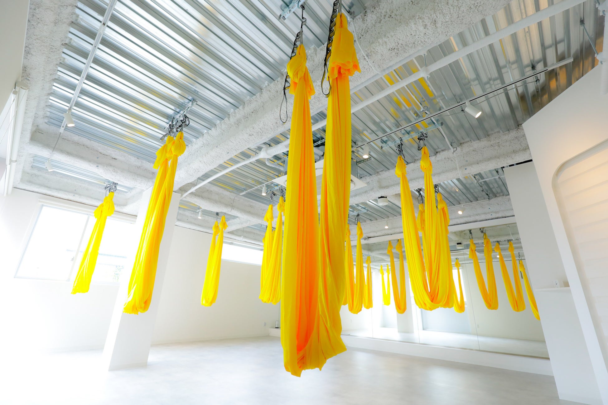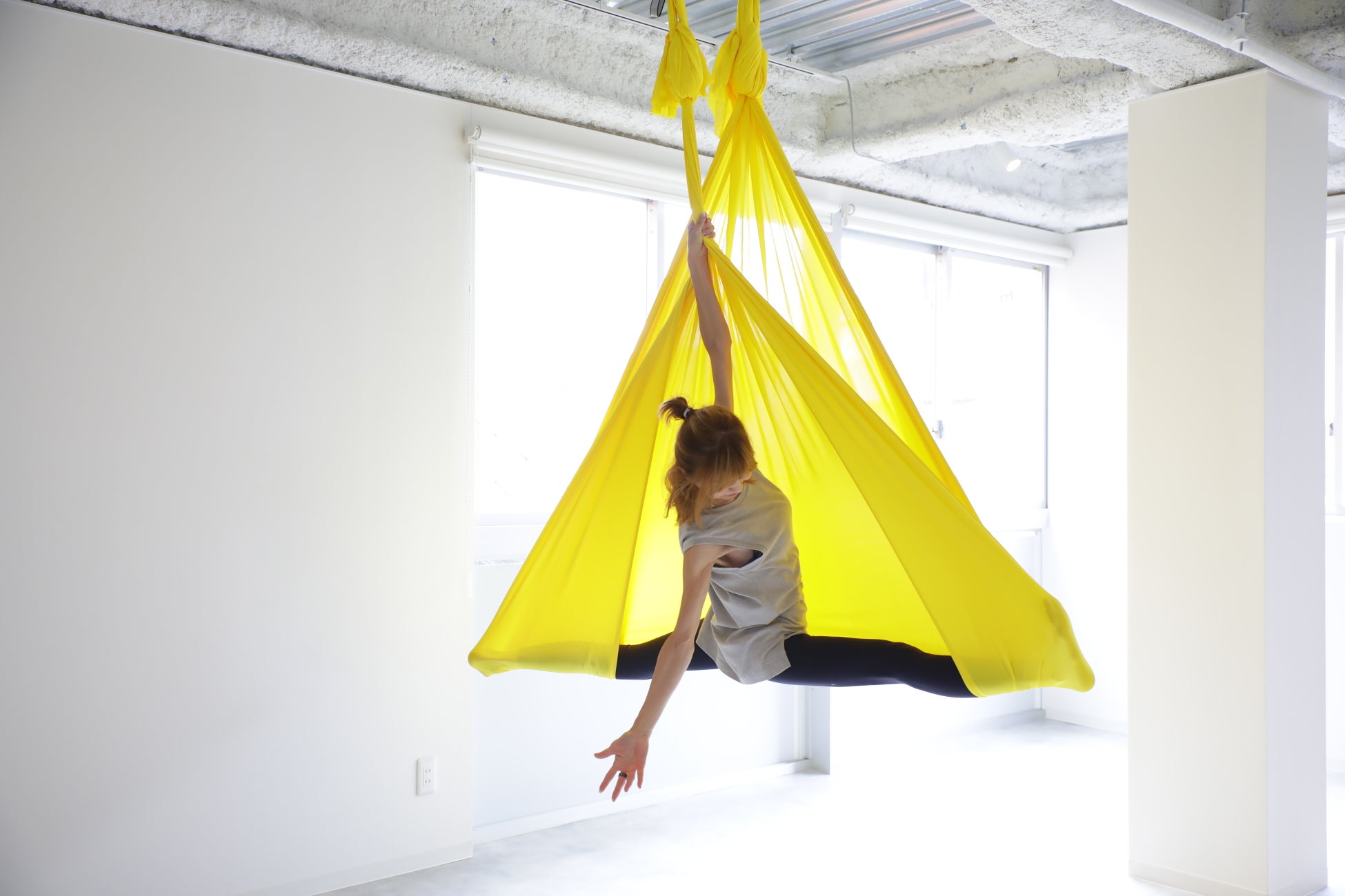 エアリアルヨガはニューヨーク発祥のヨガスタイル。布を使った「空中ヨガ」とも呼ばれおり、非日常を味わえる感覚、布を使うことで全身のストレッチやリンパの刺激、体幹トレーニングができる為、都内を中心に大人気のヨガです。