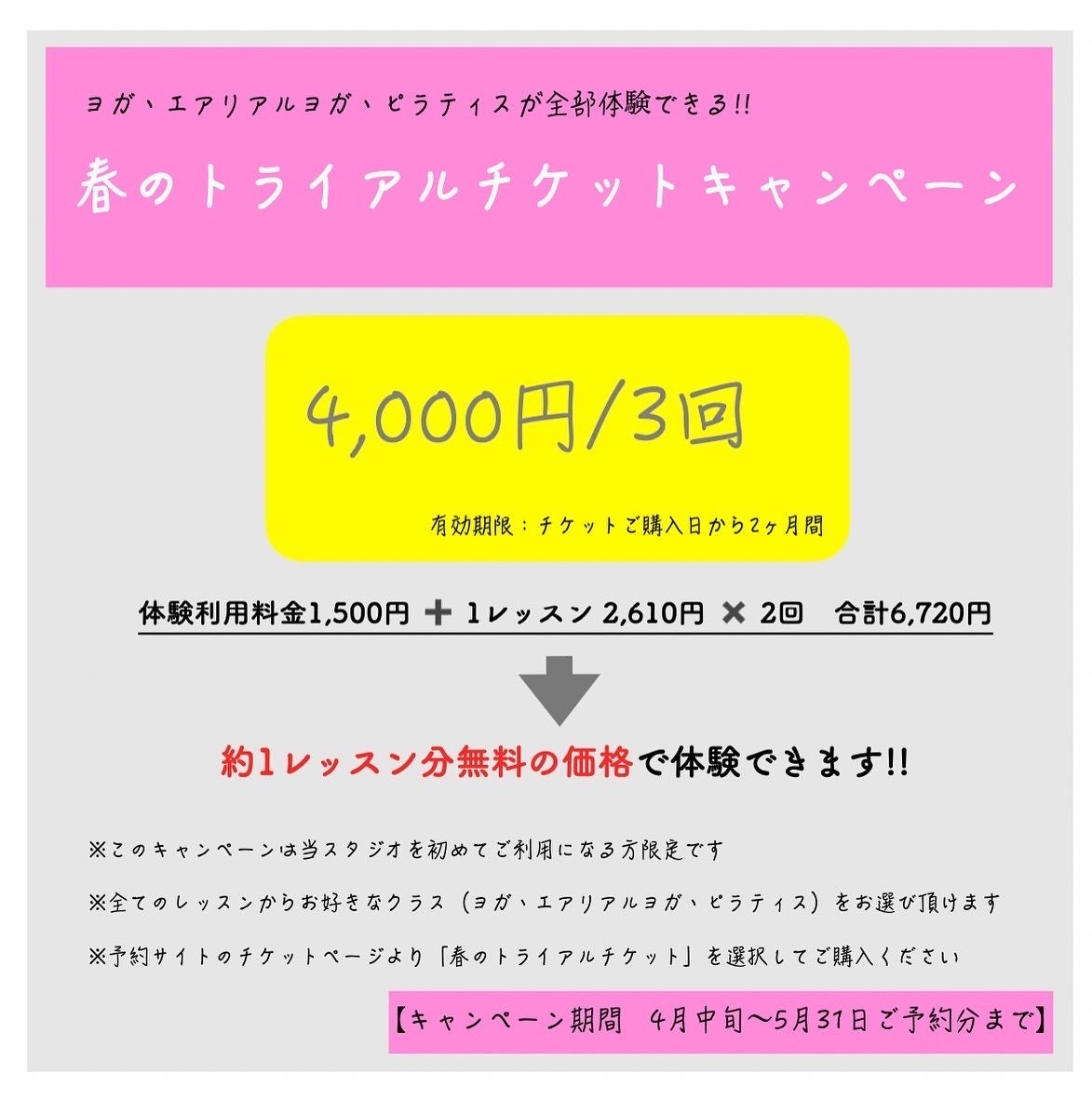 現在、Studio Asileでは新規にお越し頂くお客様に対して「春のトライアルチケットキャンペーン」を行っています。