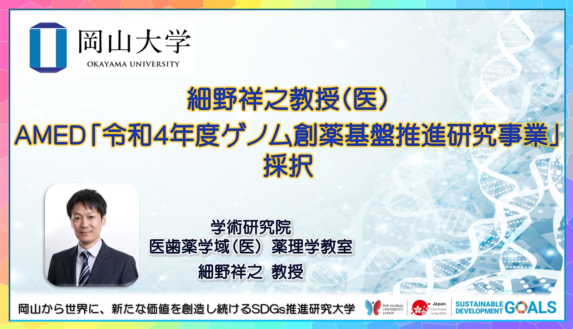 国立大学法人岡山大学(本部:岡山市北区、学長:槇野博史)学術研究院医歯薬学域(医学系)薬理学教室の細野祥之教授が、国立研究開発法人日本医療研究開発機構(AMED)の「令和4年度ゲノム創薬基盤推進研究事業」に採択されました。