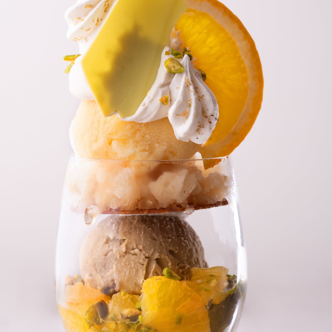 愛媛産の夏みかんのソルベとシチリア・ブロンテ村産のピスタチオのみを使用したピュアピスタチオジェラートをメインに、カモミールの香りを加えて華やかに仕上げた美しいパフェ。グラスの中にあえて作った余白の効果で、スプーンを入れるごとに上の食材と下の食材が混ざり合い、最後の一口まで新鮮な味わいが楽しめる趣向です。