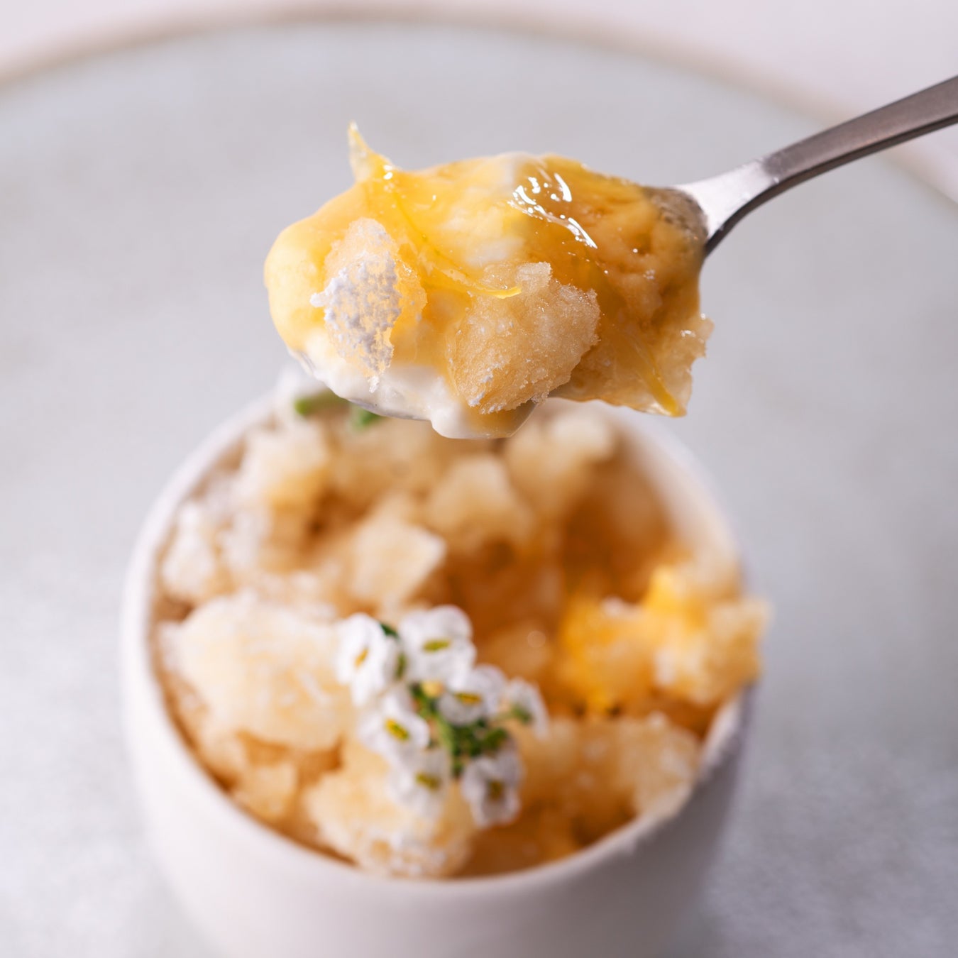 愛媛県今治市の大三島で作られる「神の島レモン」のコンフィチュールをしのばせたココナッツのブランマンジェ。レモンカードやレモンとエルダーフラワーのグラニテをたっぷり重ねた、軽やかなお口直しのヴェリーヌ(グラススイーツ)です。