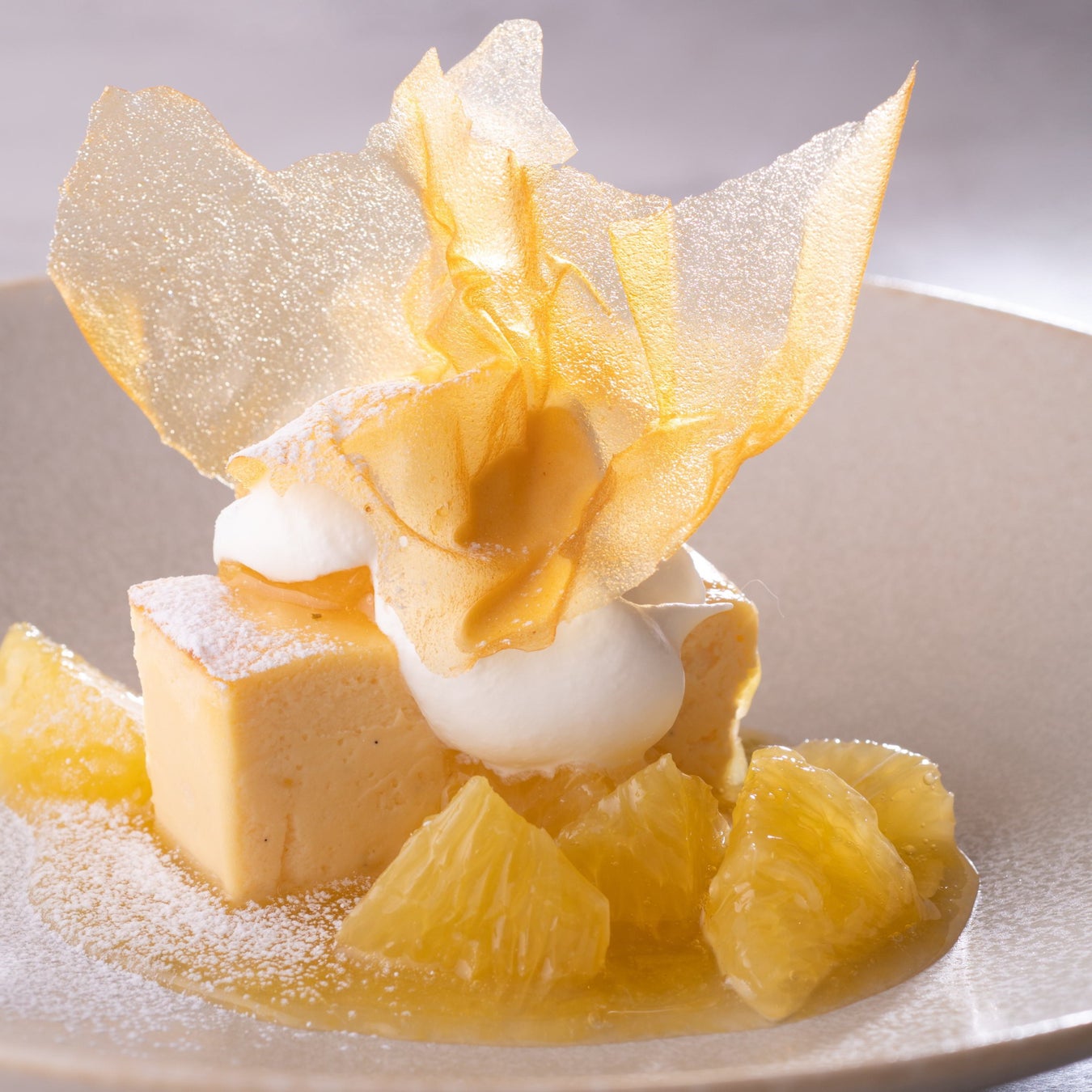 季節のフルーツを主役に迎え、シェフのこだわりを詰め込んだアレンジメニューが話題を集める当店のフルコース。春から初夏にかけてのさわやかな季節を彩る新作は、フレッシュな「柑橘」をメインフルーツに。「チーズケーキ」「ブランマンジェ」「パフェ」で構成される贅沢なオリジナルコースに、旬の柑橘のフレッシュな魅力を存分にちりばめました。ブリーチーズやエルダーフラワー、ピスタチオなど、柑橘の味わいをいっそう引き立てる食材との新鮮なペアリングにもご注目ください。