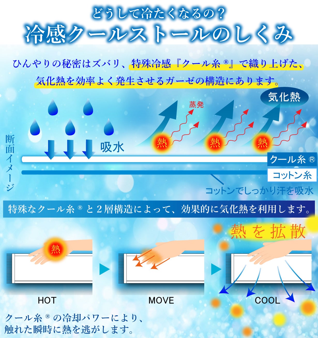 触れるだけでひんやり気持ちいい。特殊な接触冷感素材の魔法の糸、クール糸®使用