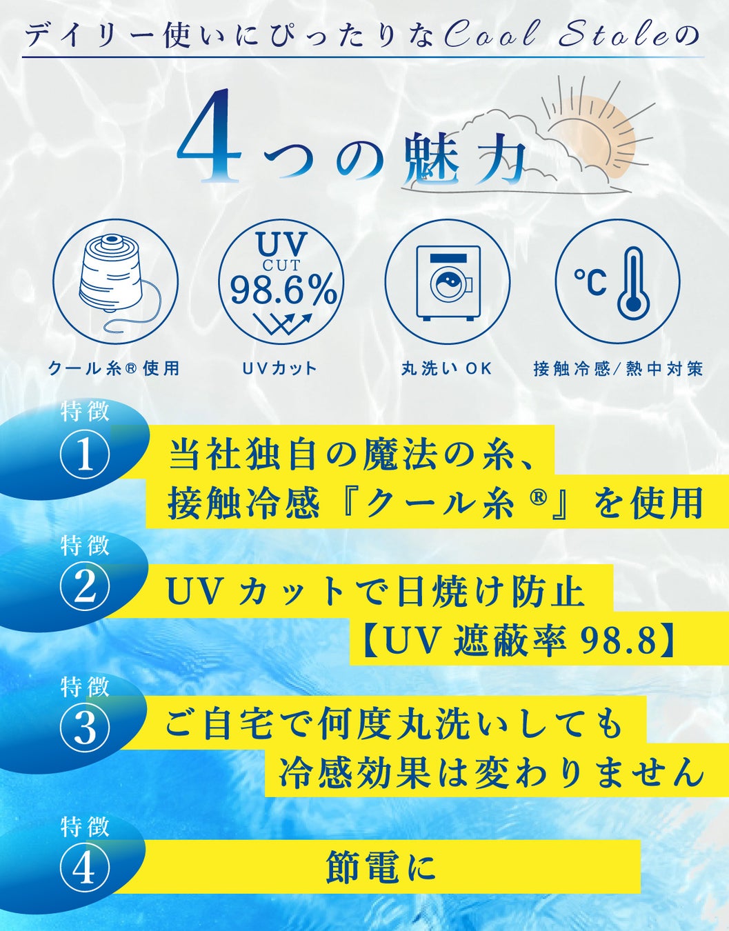 魔法のクール糸®によるひんやり接触冷感で、暑さ対策に加え、UVカット効果もあるので、夏の様々なシーンで活躍します。 https://www.makuake.com/project/jogan49/