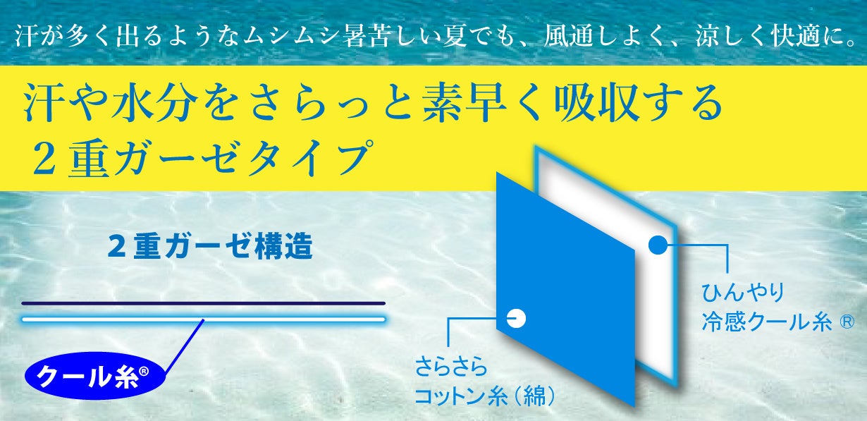 表面にはさらさらとしたコットン生地を、肌に直接触れる裏面には接触冷感ひんやりクール糸®︎の生地で織り上げた2重ガーゼ構造です。 https://www.makuake.com/project/jogan49/
