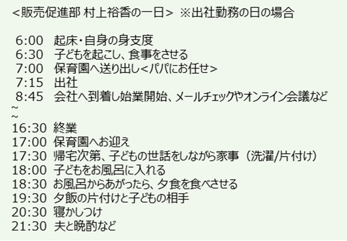 販売促進部で働く村上裕香は、2020年12月に産休をを取得し2021年1月に出産を経て、2021年10月に復職をしたママ社員です。