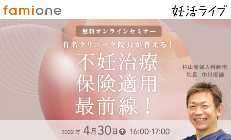「子どもを願うすべての人によりそい 幸せな人生を歩める社会をつくる」をビジョンに掲げ、LINEを活用した妊活コンシェルジュサービス「famione(ファミワン)」 https://lp.famione.com/ を提供する株式会社ファミワン(本社:東京都渋谷区、代表取締役:石川 勇介、以下当社)は、杉山産婦人科(東京都世田谷区、理事長 杉山力一)の新宿院長 中川浩次先生を講師にお迎えし、オンラインセミナー「有名クリニック院長が答える!不妊治療保険適用 最前線」の無料開催を行います。