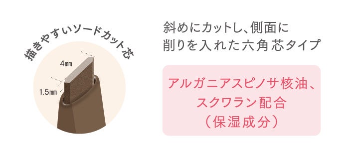 粘度の高い成分※1を配合することで高密着なのにふんわり自然な仕上がりを叶えます。さらに人肌で溶ける成分※2配合でするすると伸びよくなめらかな描き心地です。六角芯の角を使えば眉尻の書き足しが、面を使えば眉頭~眉山の隙間埋めができ、アイブロウペンシル1本でも眉メイクが完成します。