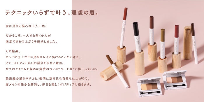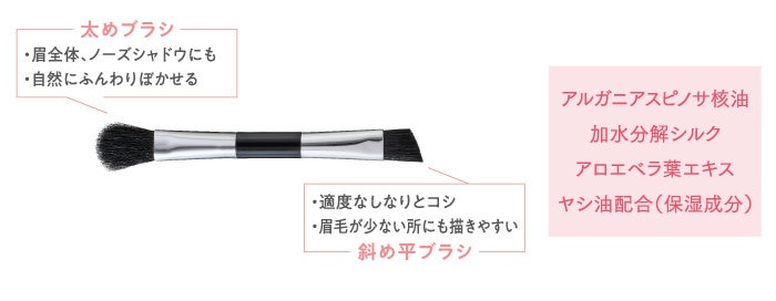 毛にしっかり密着して高発色が叶うおわん型パウダーと、柔らかく柔軟性のある球状パウダーがしっかりと眉に付着し、ふんわり&美発色に。肌への当てやすさを意識した角度がついた極小ブラシが、地肌にもつきにくくキレイにムラなく色づけます。
