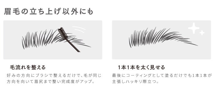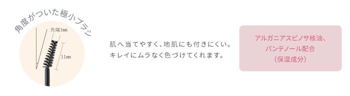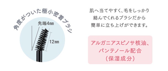 3つの被膜形成成分※4が毛を立ち上げて眉を強調するトリプルホールド設計。ラメ入りの透明ジェルが眉に立体感を与えます。角度がついた極小ブラシが肌へ当てやすく、毛をしっかり絡めるので簡単に立ち上げができます。