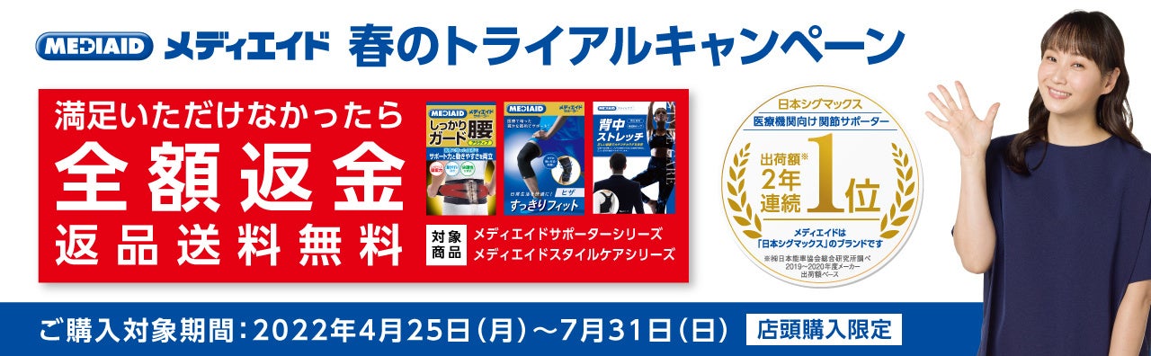 日本生まれのサポーター専業ブランド「MEDIAID(メディエイド)」を展開する、日本シグマックス株式会社(本社:東京都新宿区、代表取締役社長:鈴木洋輔)は、関節用サポーターをはじめとするメディエイド製品をお試しいただいたうえで、満足いただけなかったお客様に購入金額全額をお返しする「トライアルキャンペーン」を開催いたします。