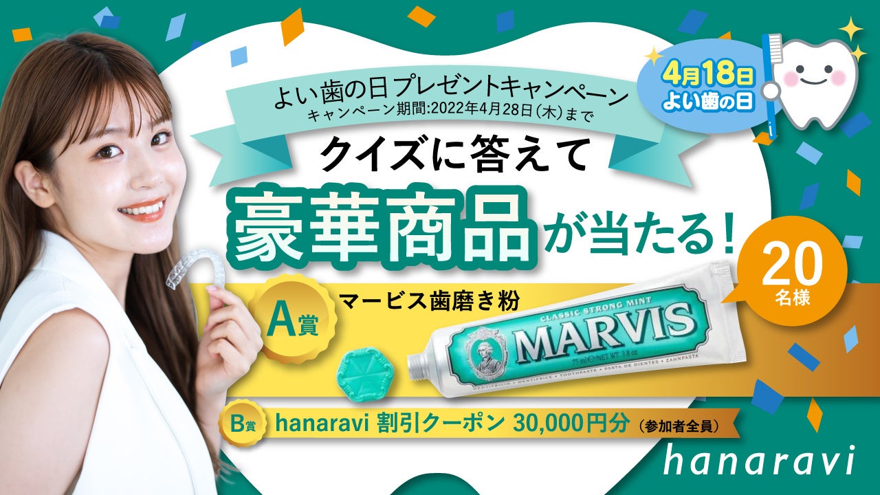 hanaraviの公式Twitter @hanaravi__では、豪華商品が当たる「#よい歯の日 クイズキャンペーン」を実施します。クイズに答えて頂いた方全員にhanaravi3万円割引クーポンと、抽選で20名の方にマービス歯磨き粉をプレゼントします。