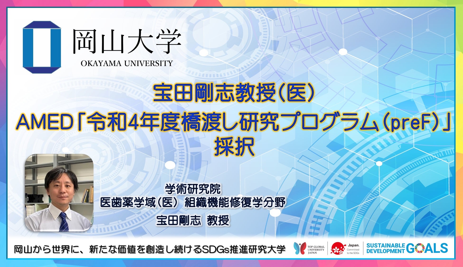 国立大学法人岡山大学(本部:岡山市北区、学長:槇野博史)学術研究院医歯薬学域(医学系)組織機能修復学分野の宝田剛志教授が、国立研究開発法人日本医療研究開発機構(AMED)の「令和4年度橋渡し研究プログラム(preF)」に採択されました。